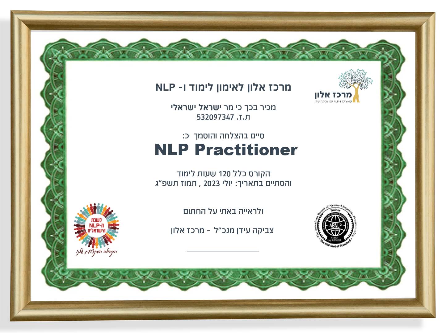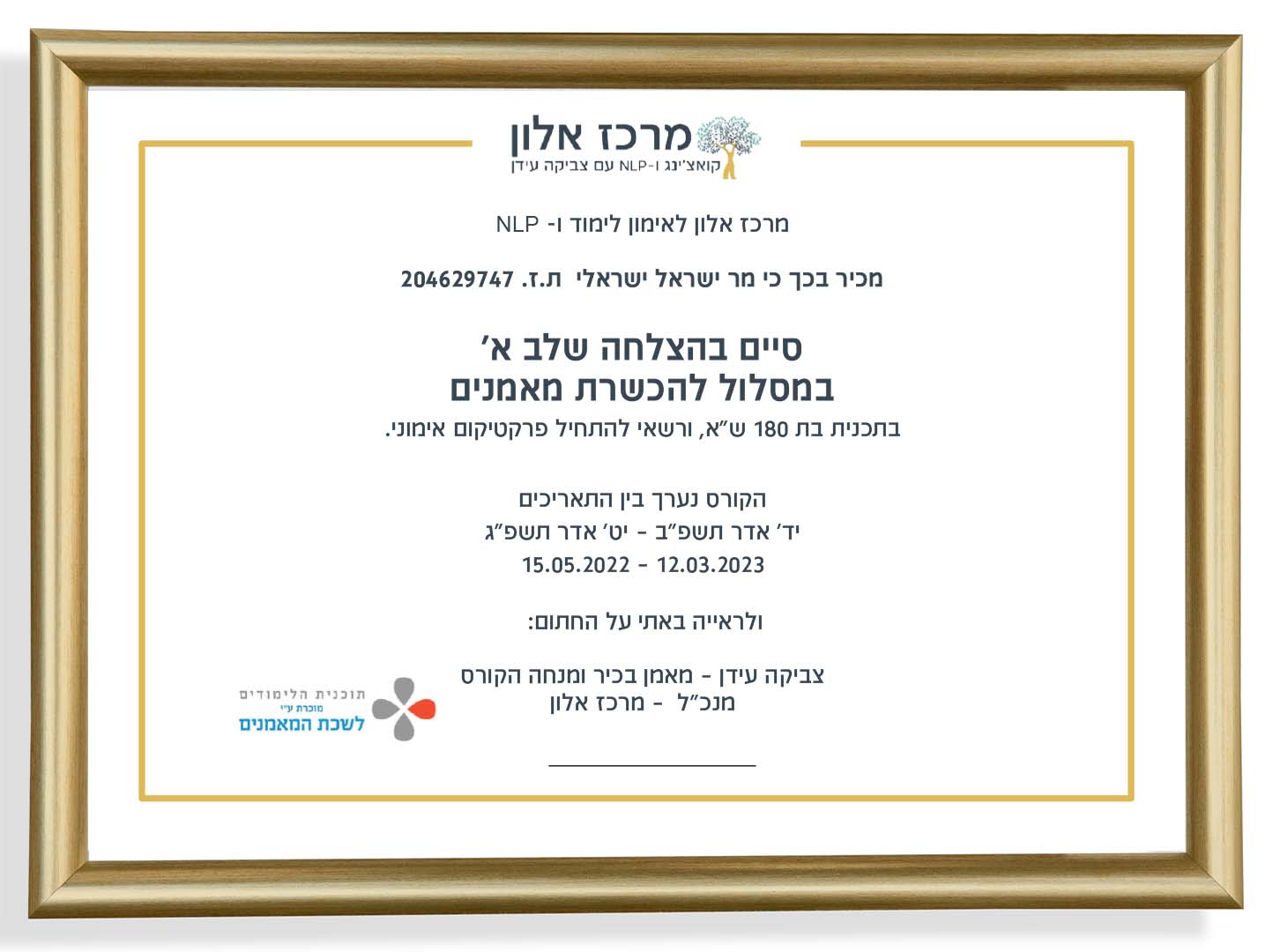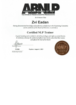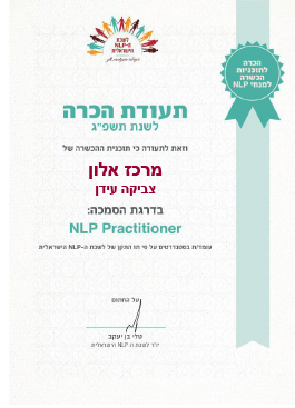 תעודת בוגר קורס הכשרת מאמנים מטעם לשכת המאמנים הישראלית. תעודה NLP PRACTITIONER מטעם לשכת ה N.L.P ומטעם הארגון הבינ"ל הגדול בארה"ב ABNLP